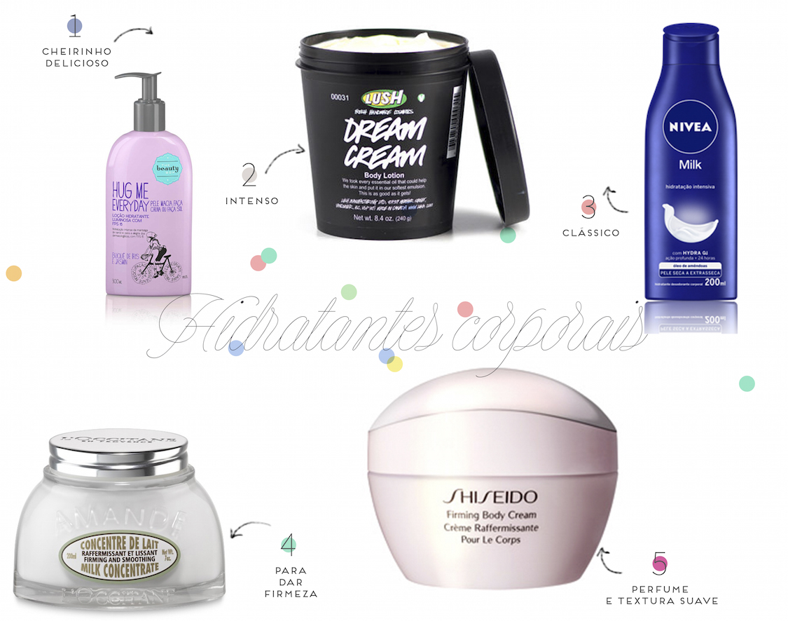 Gosto de variar o hidratante sempre. Uns mais intensos, outros bem levinhos, alguns com, outros sem fragrância… Existem vários com proteção solar ou até alguns brilhos (ideias para um festa a noite, por exemplo). As misturinhas de óleos calmantes, leite e amêndoas são as minhas favoritas!