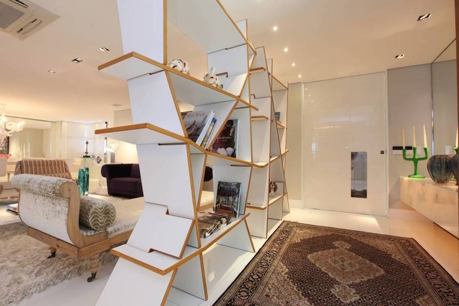 Eu adoro a mistura do branco com madeira, mesmo quando é super delicada. Uma casa mais clara, com cores neutras fica ótima com esse modelo de estante. A decoração fica super charmosa, porque além de ser útil, a peça se transforma quase que em uma obra de arte ou um painel que ajuda a dividir ambientes.