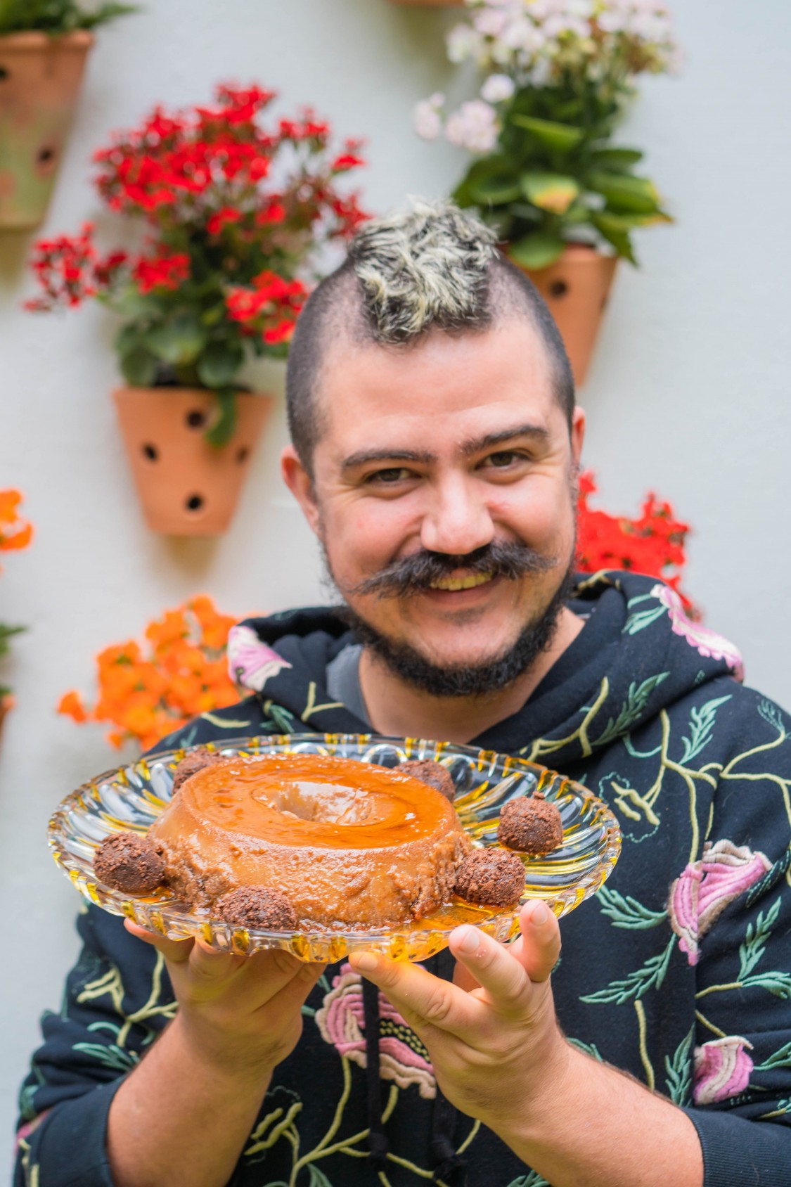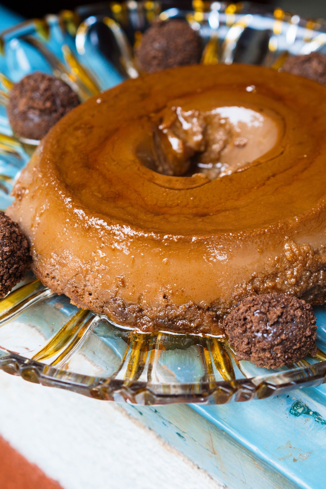 Desenforme o pudim e finalize com os brigadeiros de ovomaltine.