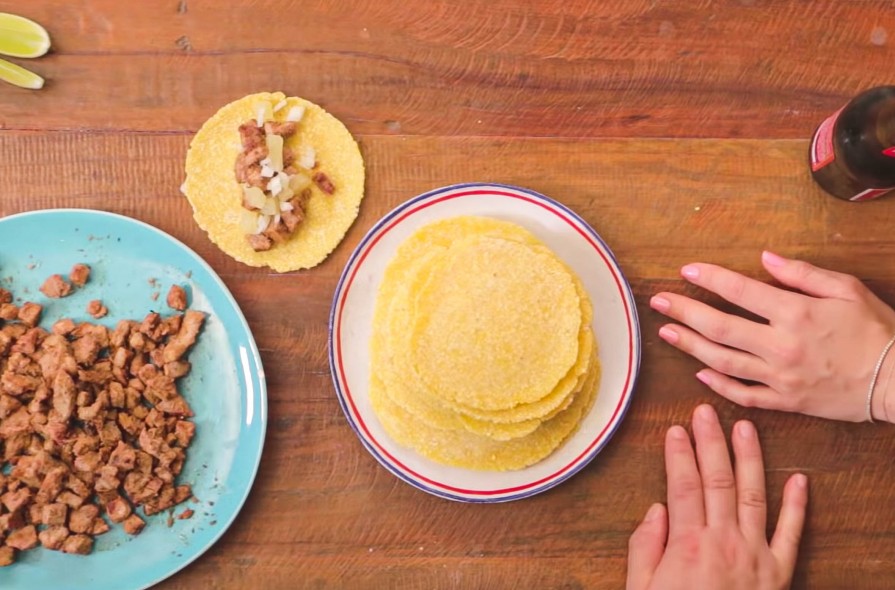 Coloque pedacinhos de carne em cima da tortilla e finalize com abacaxi, cebola, coentro e pedacinhos de dedo de moça verde.