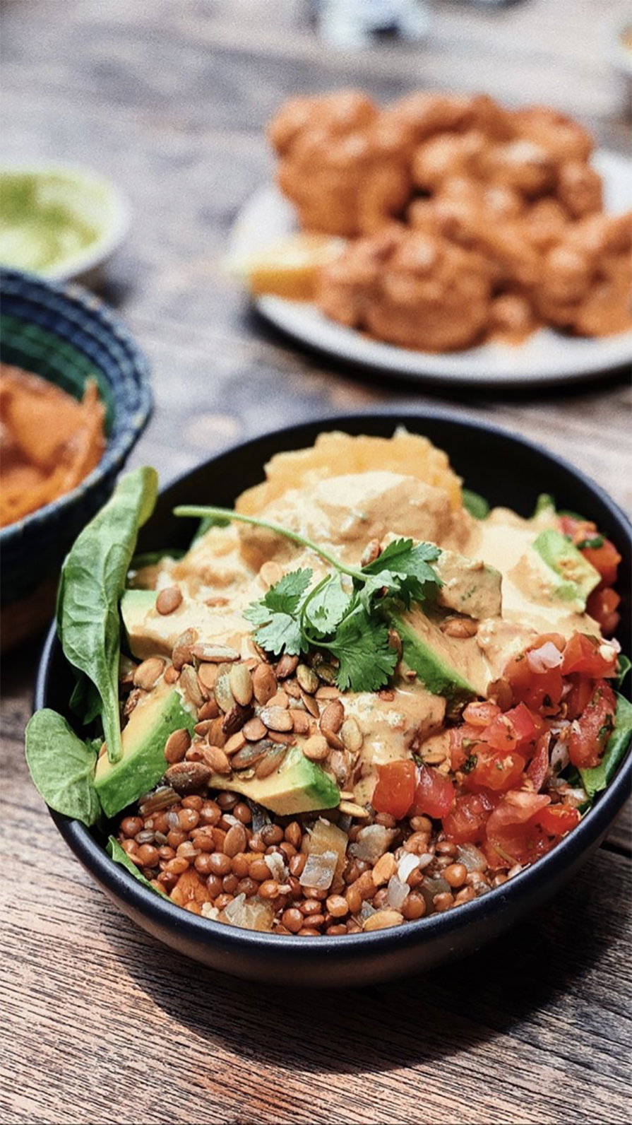 - DOS: lentilhas assadas, molho de amendoim, espinafre, pico de gallo, arroz de coco e salsa de abacaxi, sementes de abóbora e abacate.